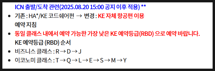 변경시 대한항공 공동운항편으로 무료변경 가능 (잔여석이 없을 시 불가)